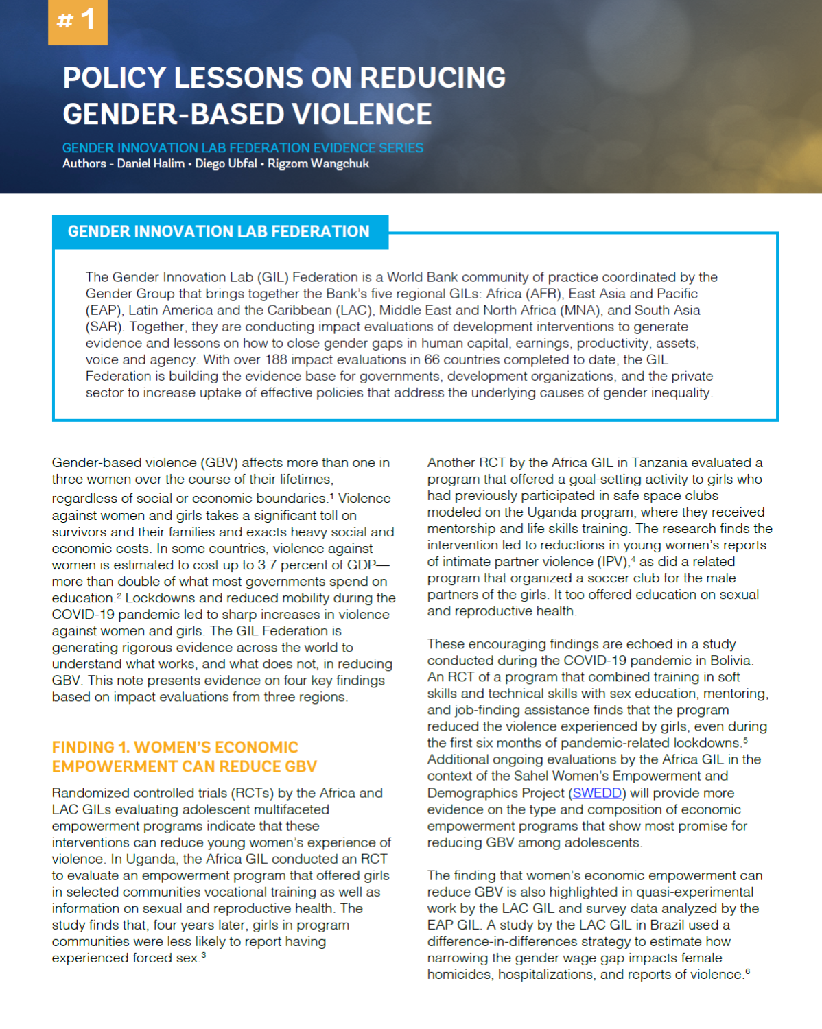 Gender-based violence (GBV) affects more than one in three women over the course of their lifetimes, regardless of social or economic boundaries. Violence against women and girls takes a significant toll on survivors and their families and exacts heavy social and economic costs. In some countries, violence against women is estimated to cost up to 3.7 percent of GDP- more than double of what most governments spend on education. Lockdowns and reduced mobility during the COVID-19 pandemic led to sharp increases in violence against women and girls. The GIL Federation is generating rigorous evidence across the world to understand what works, and what does not, in reducing GBV. This note presents evidence on four key findings based on impact evaluations from three regions.