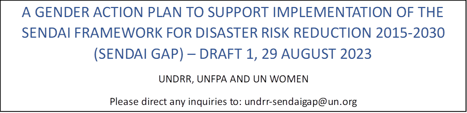 [A GENDER ACTION PLAN TO SUPPORT IMPLEMENTATION OF THE SENDAI FRAMEWORK FOR DISASTER RISK REDUCTION 2015-2030 (SENDAI GAP) - DRAFT 1, 29 AUGUST 2023 UNDRR, UNFPA AND UN WOMEN Please direct any inquiries to: undrr-sendaigap at un.org]