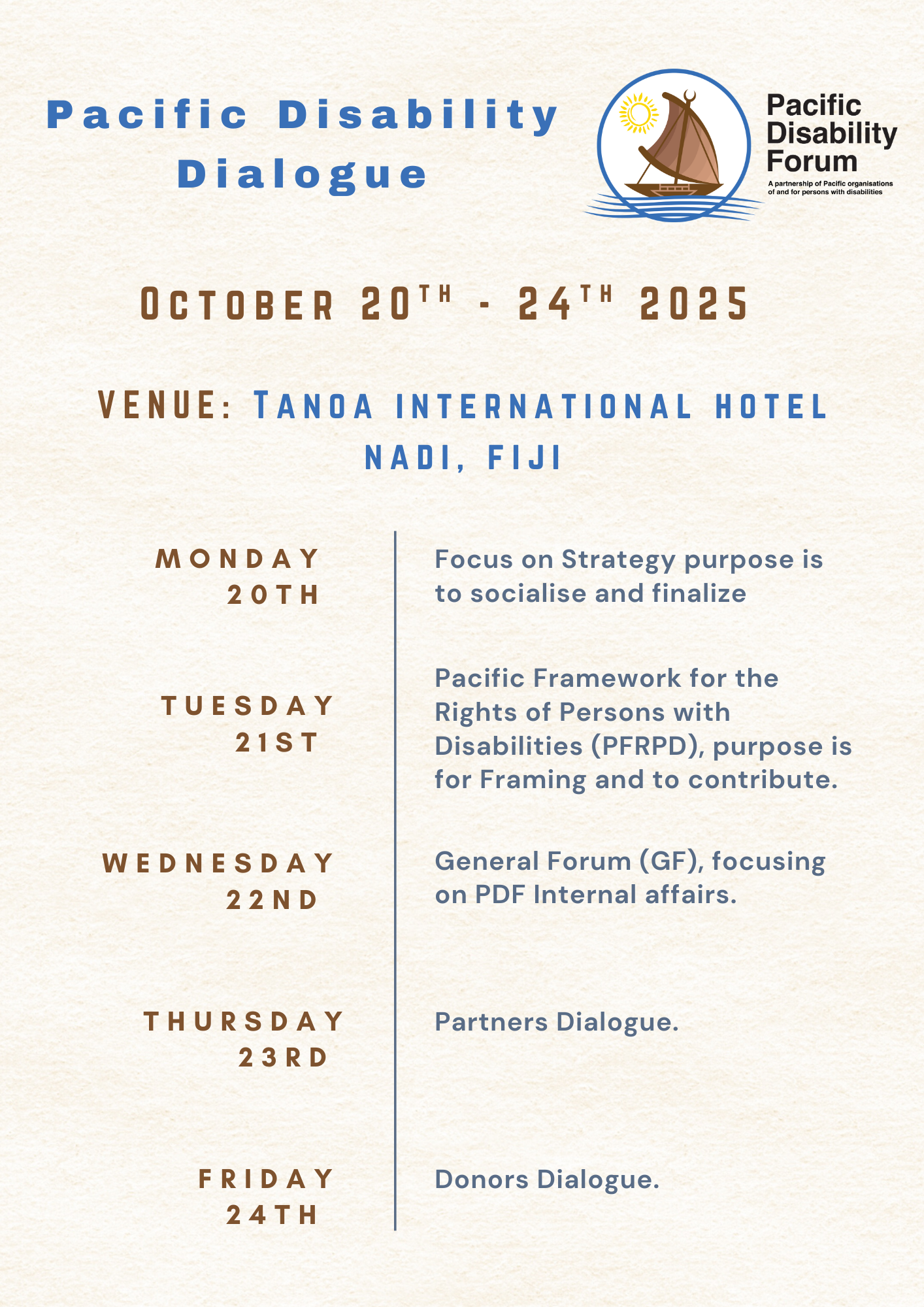 Further to my earlier email, please find attached the program flyer for the upcoming Pacific Disability Dialogue, scheduled for October 20th–24th, 2025.