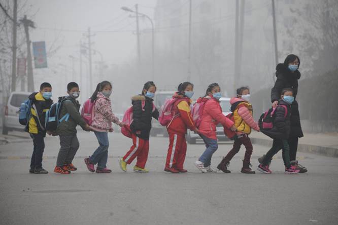 Students wearing masks amid heavy air pollution in Jinan, China. - Credit STR/Agence France-Presse - Getty Images