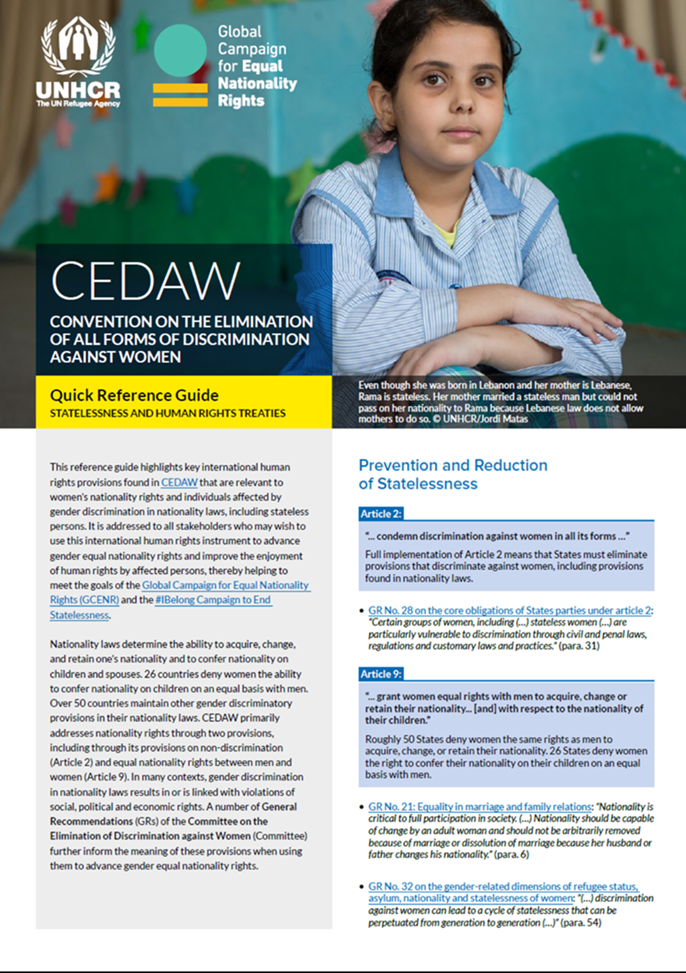 July 5, 2017 - This reference guide highlights key international human rights provisions found in CEDAW that are relevant to women’s nationality rights and individuals affected by gender discrimination in nationality laws, including stateless persons. It is addressed to all stakeholders who may wish to use this international human rights instrument to advance gender equal nationality rights and improve the enjoyment of human rights by affected persons.