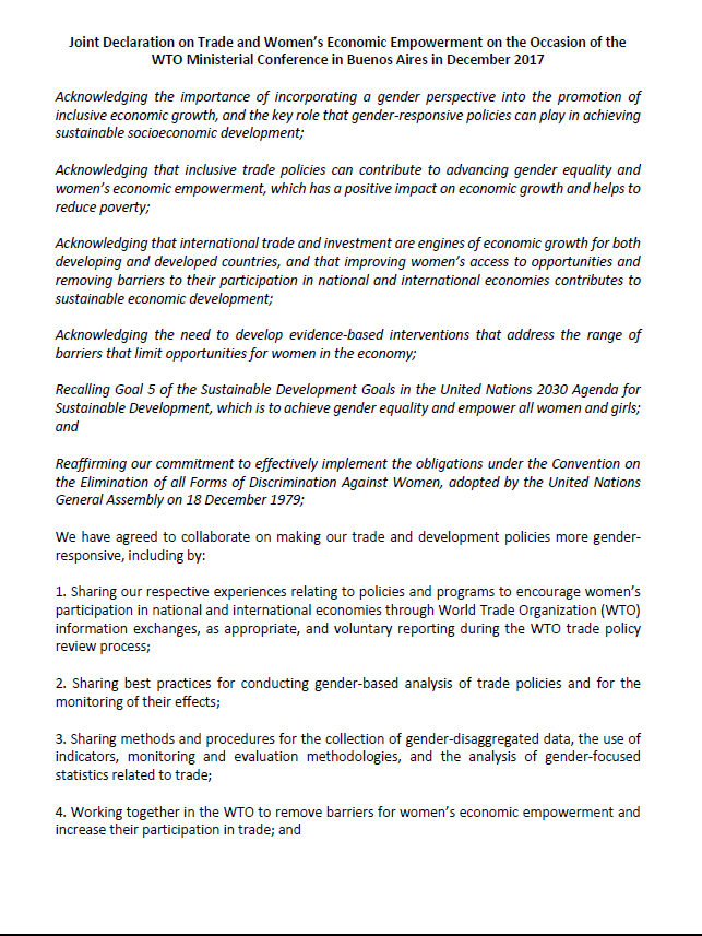 The "Joint Declaration on Trade and Women's Economic Empowerment" states without offering evidence that "international trade and investment are engines of economic growth for both developing and developed countries, and that improving women's access to opportunities and removing barriers to their participation in national and international economies contributes to sustainable economic development". This is followed by a promise to hold seminars on a range of matters including to identify 'barriers' that limit women's participation in trade, to enhance women entrepreneurs' participation in public procurement markets and the inclusion of women-led businesses, in particular MSMEs, in value chains. In 2019 a progress report would be issued.