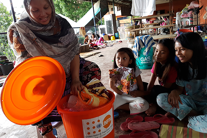 A displaced family opens up a UNFPA-supplied dignity kit Mindanao, Philippines. Dignity kits contain life-saving items such as soap, flashlights and radios. (c) UNFPA