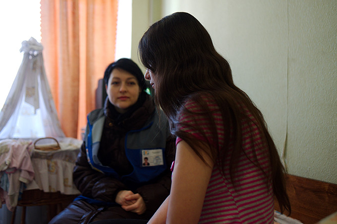 UNFPA mobile teams have reached thousands of survivors of gender-based violence in Ukraine. A young mother is assisted by a UNFPA mobile team in Sloviansk. (c) UNFPA/Maks Levin