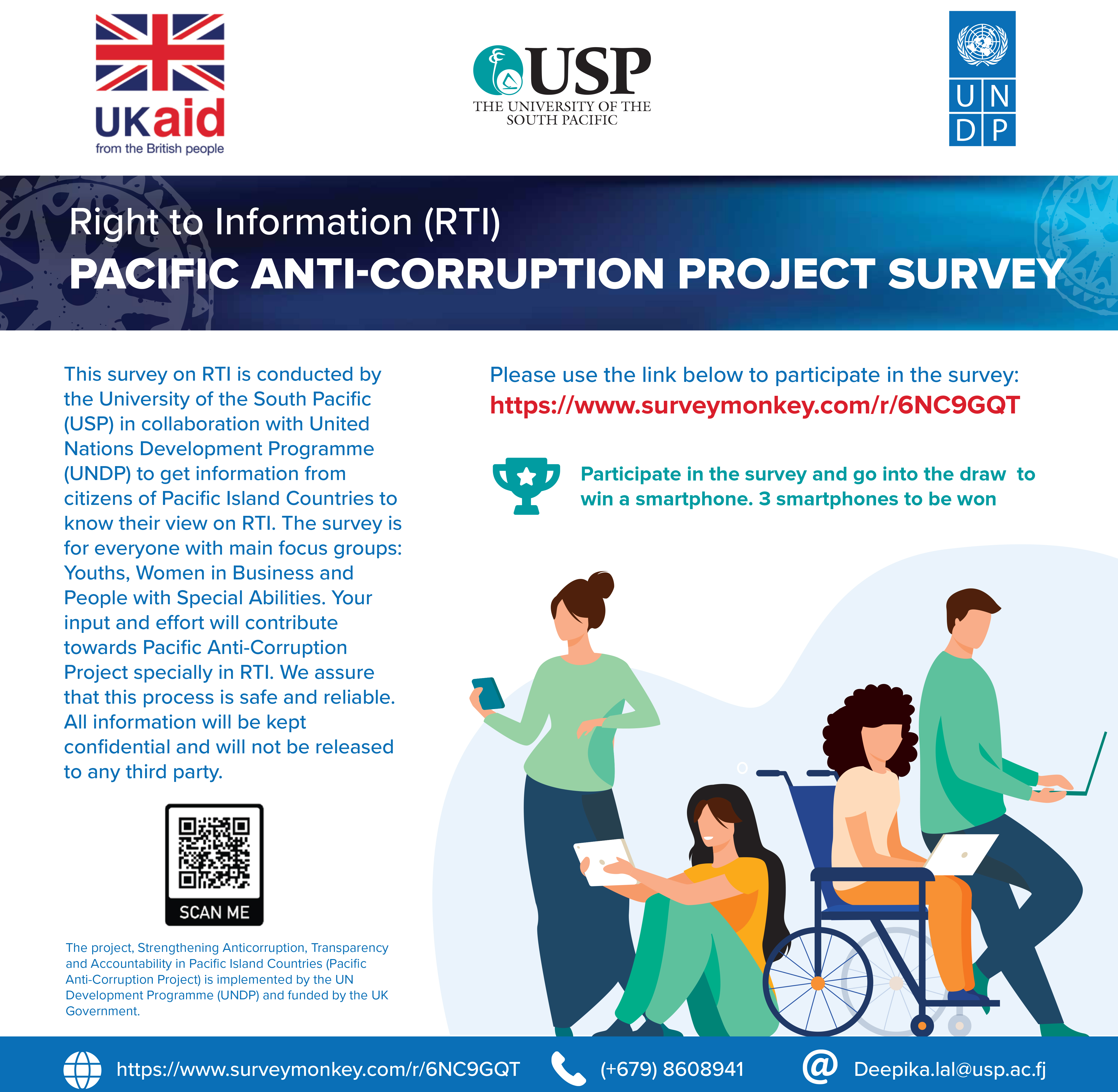 School of Information Technology, Engineering, Mathematics & Physics at University of the South Pacific (USP) in collaboration with United Nations Development Programme (UNDP) is conducting an online survey to find out how aware we are of the current practices of RTI in our countries and what are our preferences for improved promotion and exercise of the right to information. Using the feedback, we will be designing appropriate tools and information platforms to facilitate online requests and/or receipt of information and data. Therefore, your assistance in taking this survey would be greatly appreciated. Your participation also takes you into a draw where we will be giving away 3 smartphones.