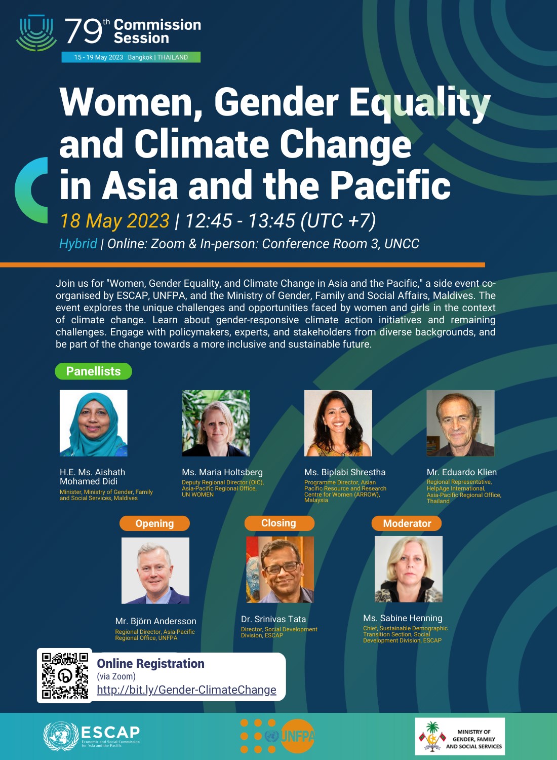 We are pleased to invite you to the side event "Women, Gender Equality, and Climate Change in Asia and the Pacific" which will take place on the sidelines of the 79th session of the Economic and Social Commission for Asia and the Pacific.