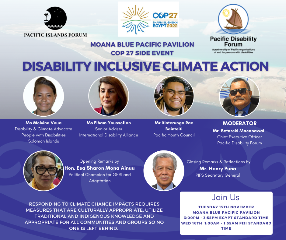 Two Pacific Island presenters will feature at this side event and they are our CEO Mr. Setareki Macanawai and Ms. Melvina Voua a young disability and climate advocate from Solomon Islands.