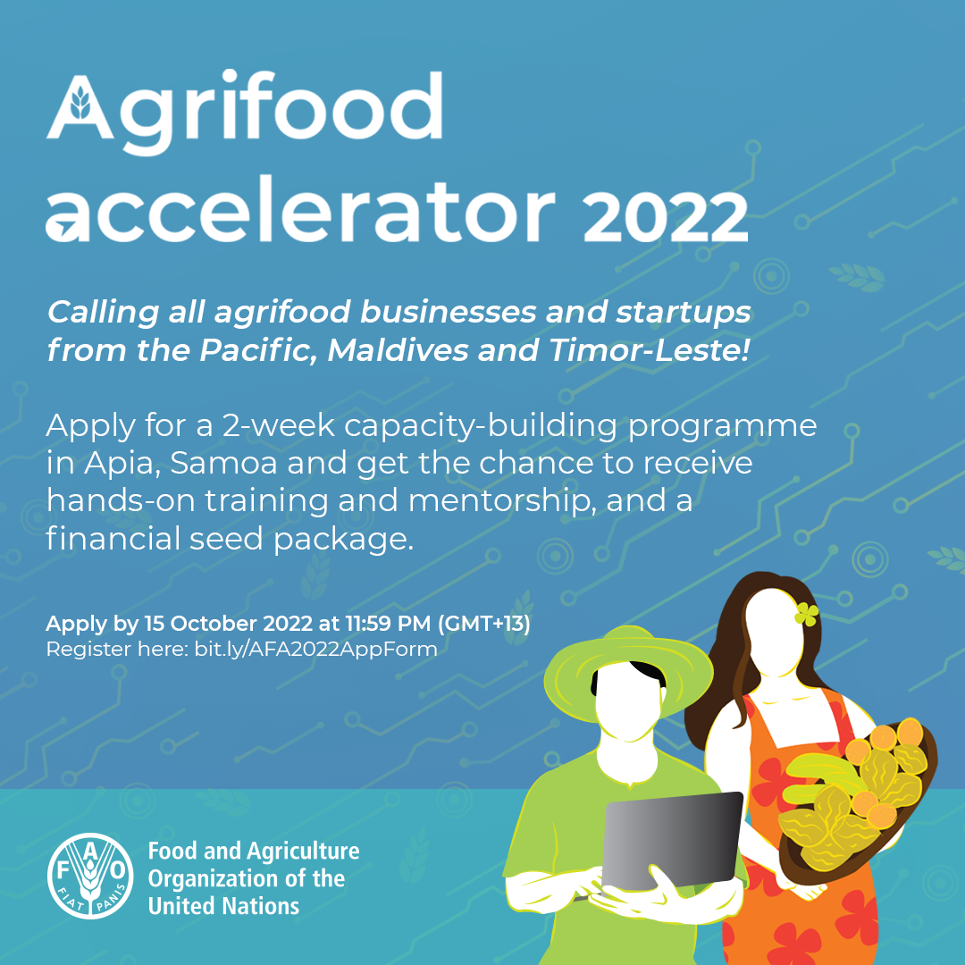 A few months from now, Food and Agriculture Organization of the United Nations<https://www.fao.org/home/en> will host a regional agrifood accelerator in the Pacific region, Maldives and Timor-Leste. The Agrifood accelerator 2022 aims to support and scale up existing agrifood businesses and startups in Small Island Developing States (SIDS).