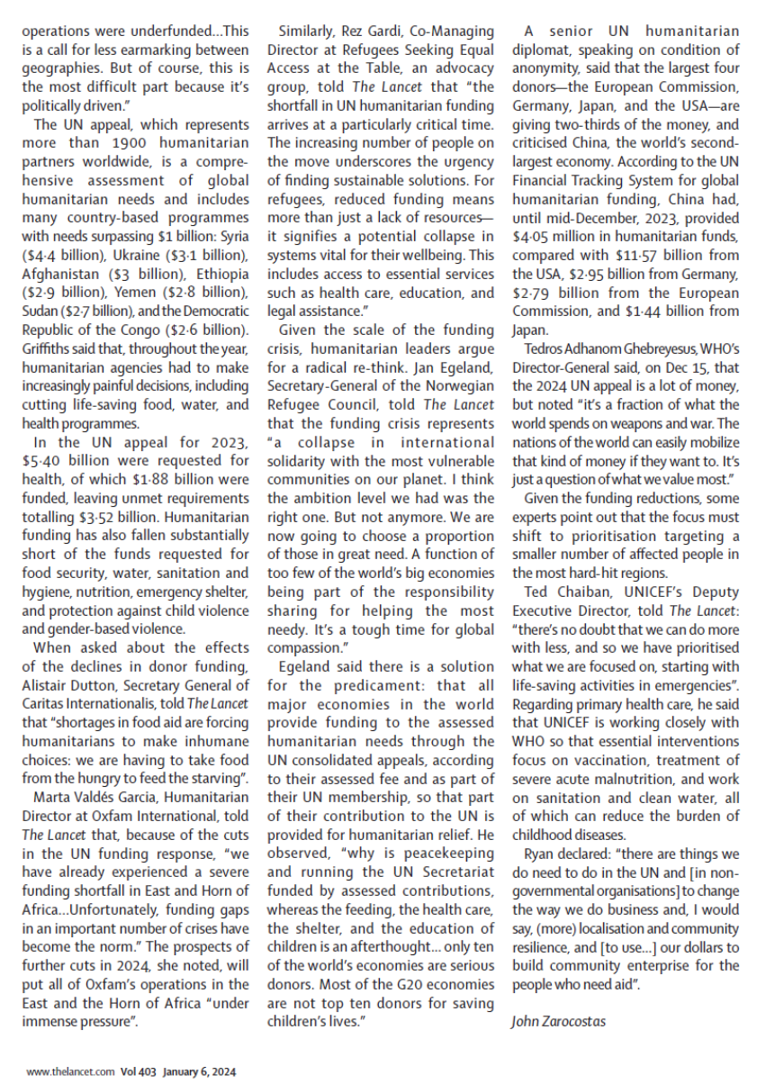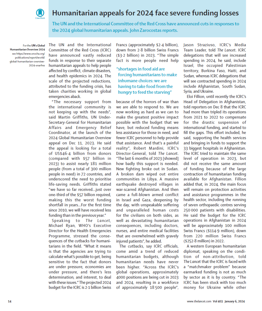 The Lancet - Humanitarian appeals for 2024 face severe funding losses (thelancet.com)<https://www.thelancet.com/action/showPdf?pii=S0140-6736%2824%2900001-1>